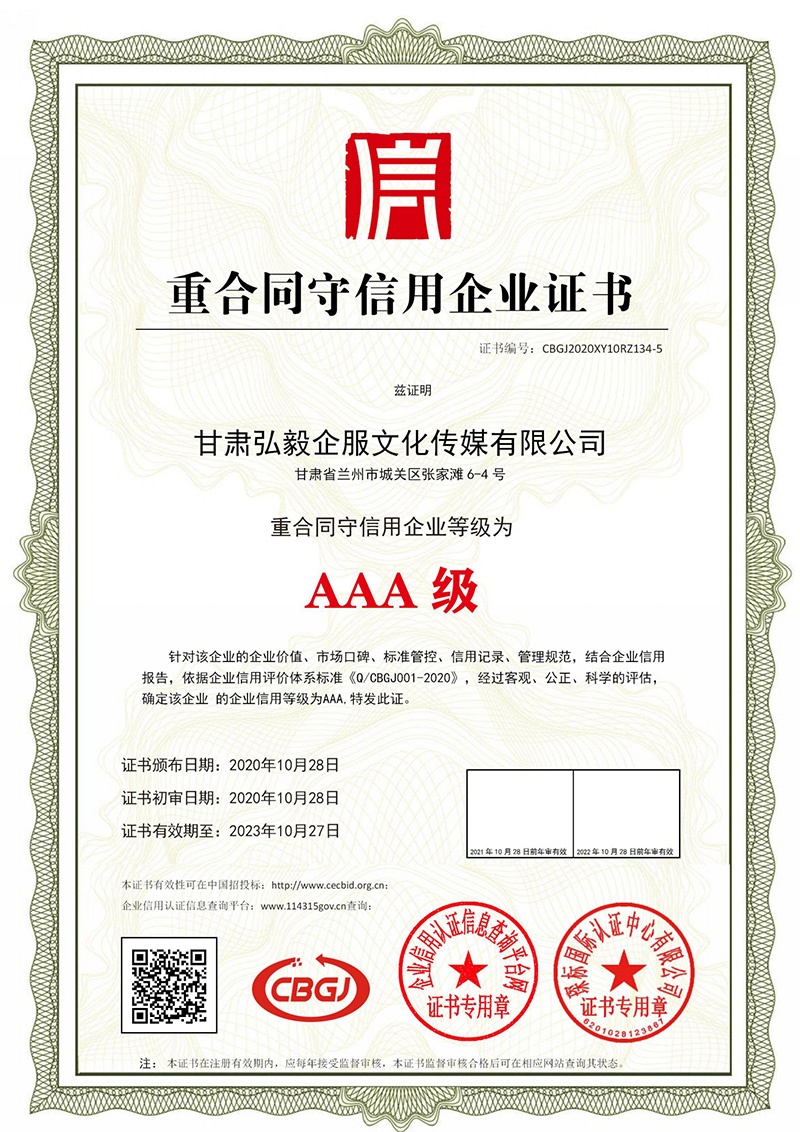 重合同守信用企业证书